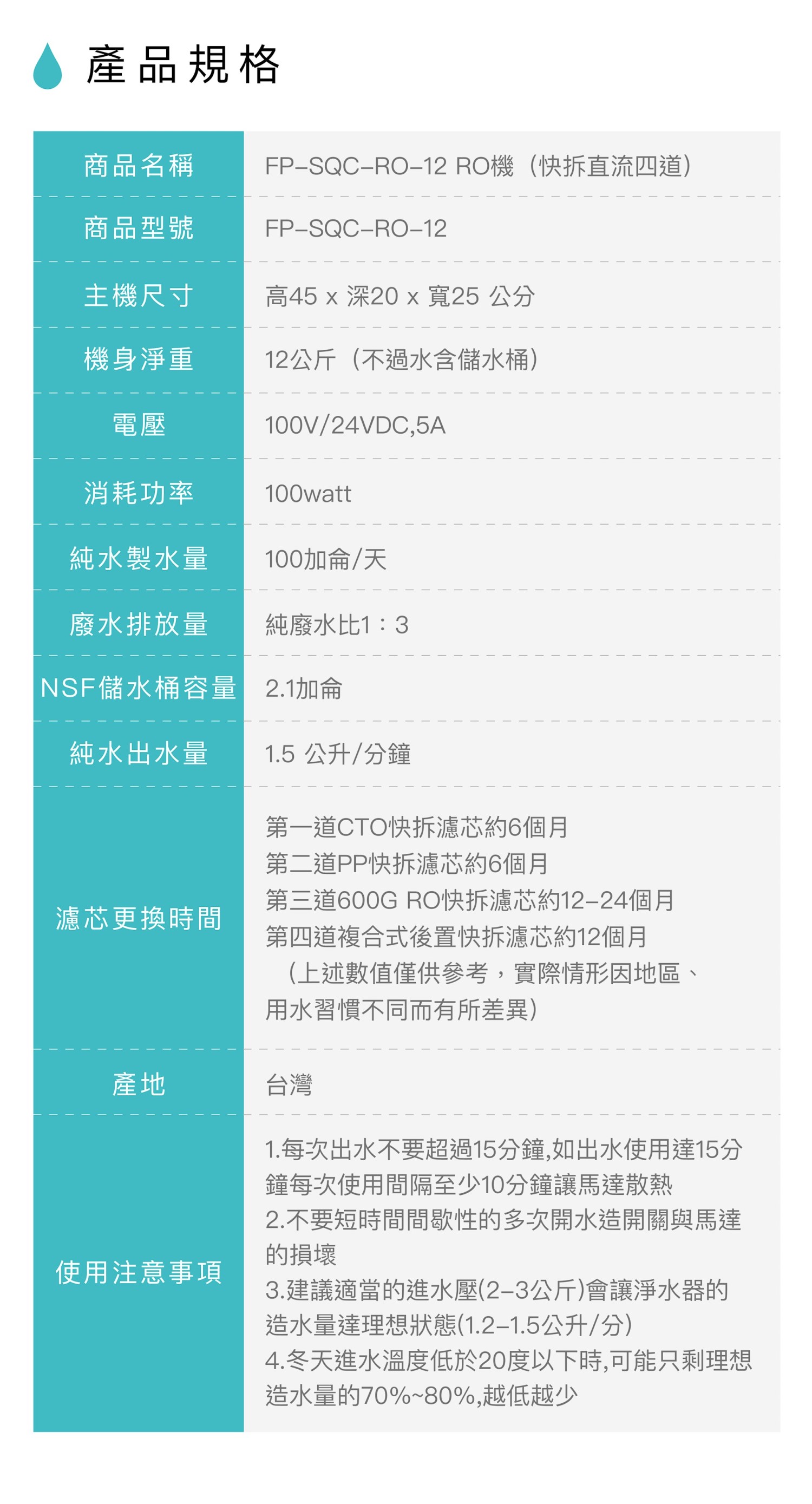 ★四道過濾達到坊間六道式RO機水準,體積縮小水質不打折 ★台灣生產組裝製造,品質值得信賴 ★增添遠紅外線陶瓷石濾料讓純水增添礦物質微量元素,並增加π化模組讓水質水分子團重整,以調整為較佳的頻率 ★全快拆式設計,更換濾心免工具,方便不費力 ★高流量馬達搭配RO膜讓出水符合直流需求,免儲水桶讓設備空間更精省